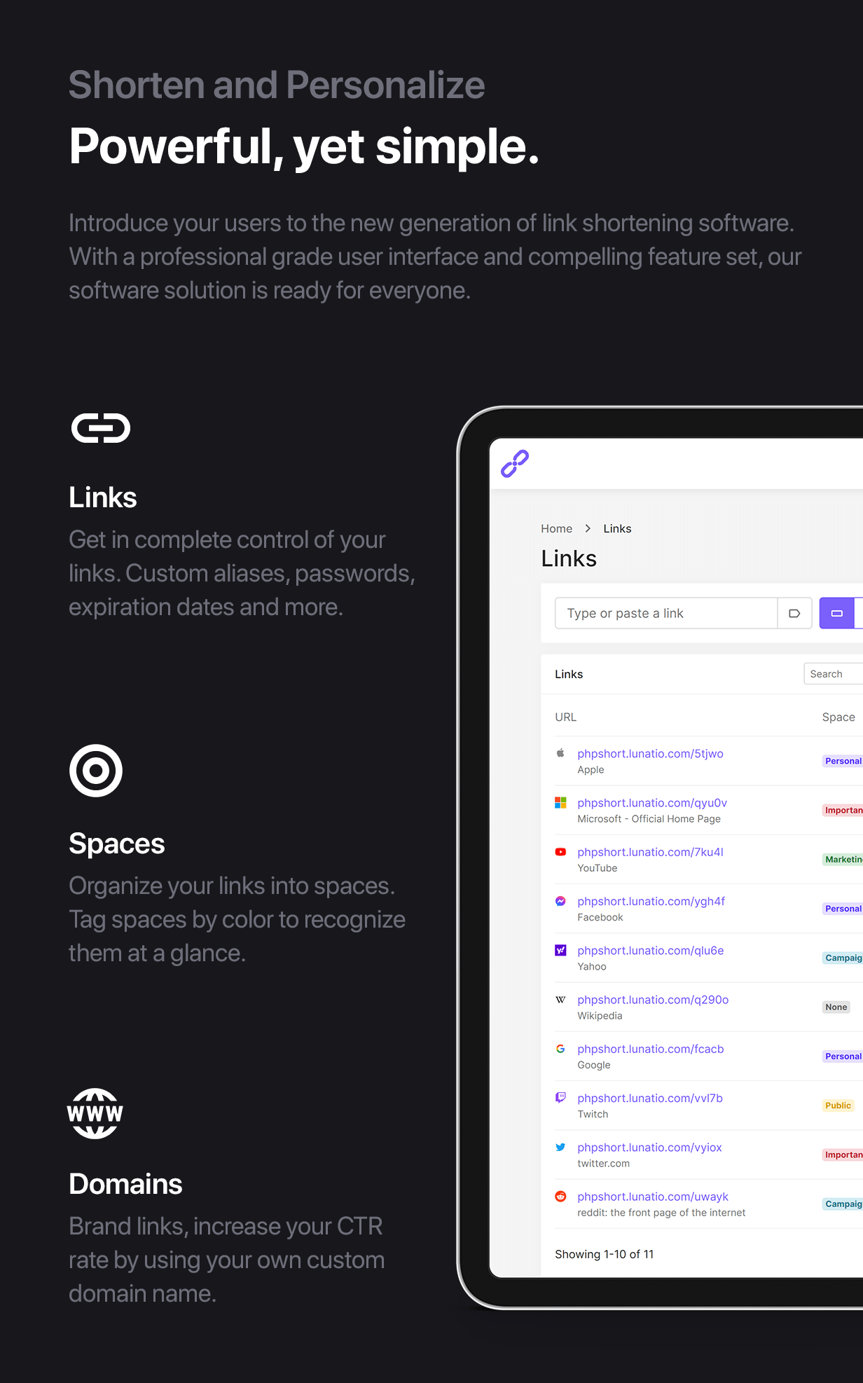 DASHBOARD – Get the account overview at a glance. Quickly manage your latest or most popular Links.LINKS – Shorten links, one at a time, or in bulk. Add custom aliases, protect them with passwords, set expiration dates, custom targeting rules and more.