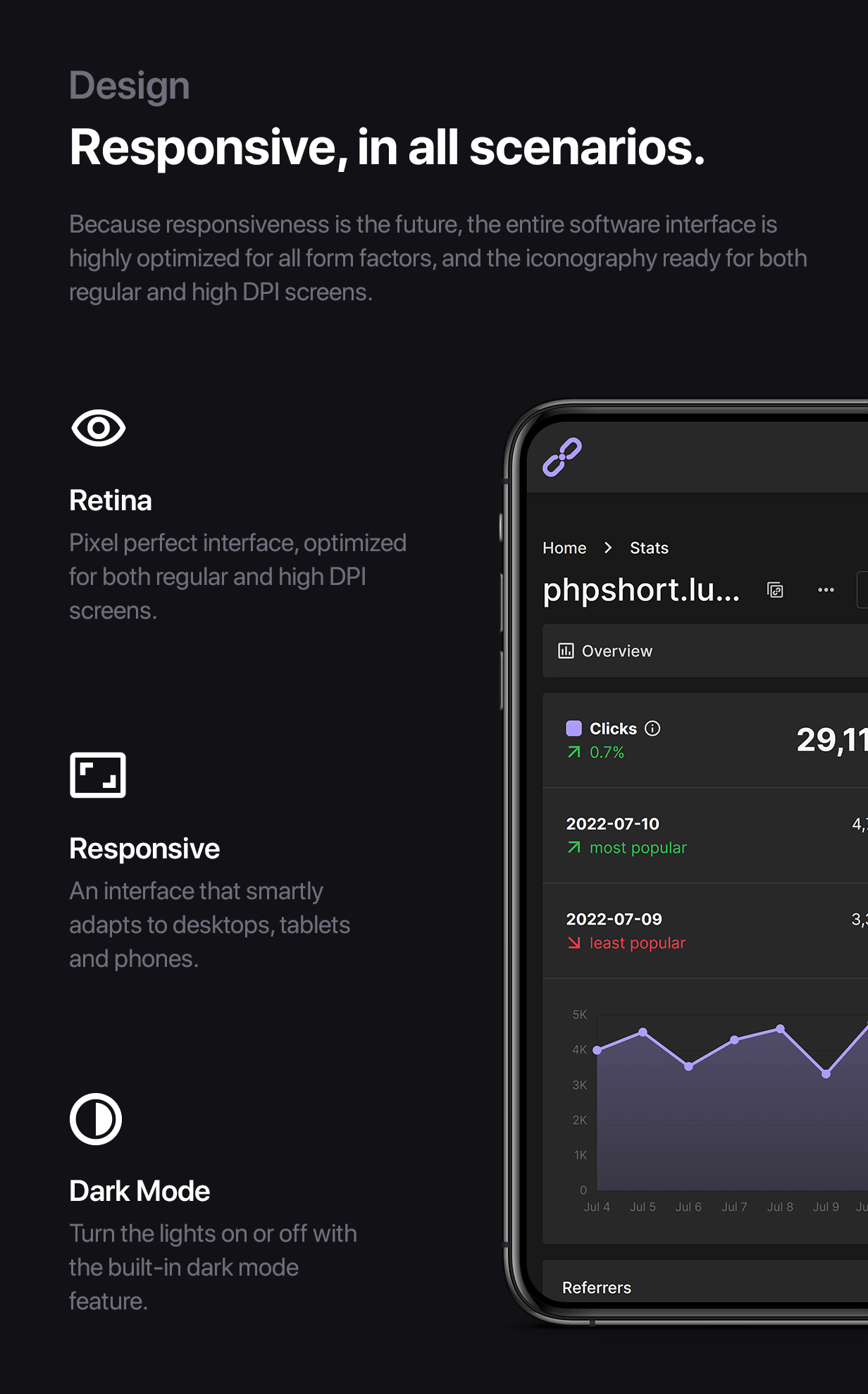 STATS – Get analytics insights for your links about your audience Overview, Referrers, Countries, Cities, Languages, Platforms, Browsers, and Devices.